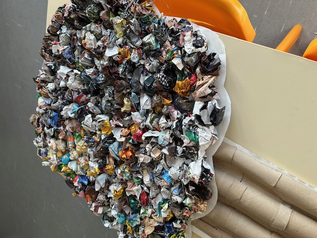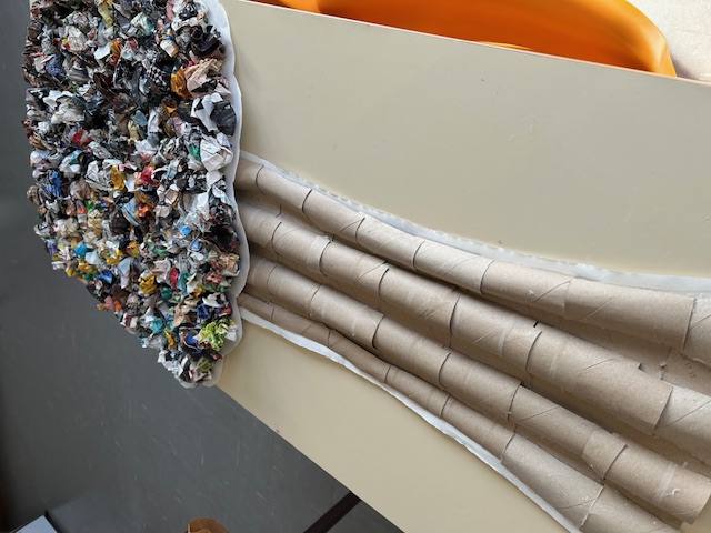 # Recolha de rolos de papel higiénico vazios para confecionar o tronco da árvore (uso de cola quente)