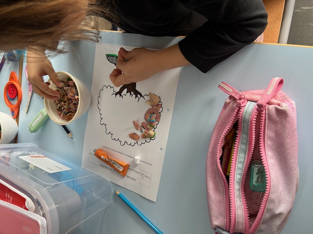 # Colagem de aparas de lápis com cola UHU para encher as letras do cartaz e árvores de enfeite