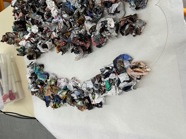 # Colagem de papel de revista amassado para encher a copa da árvore