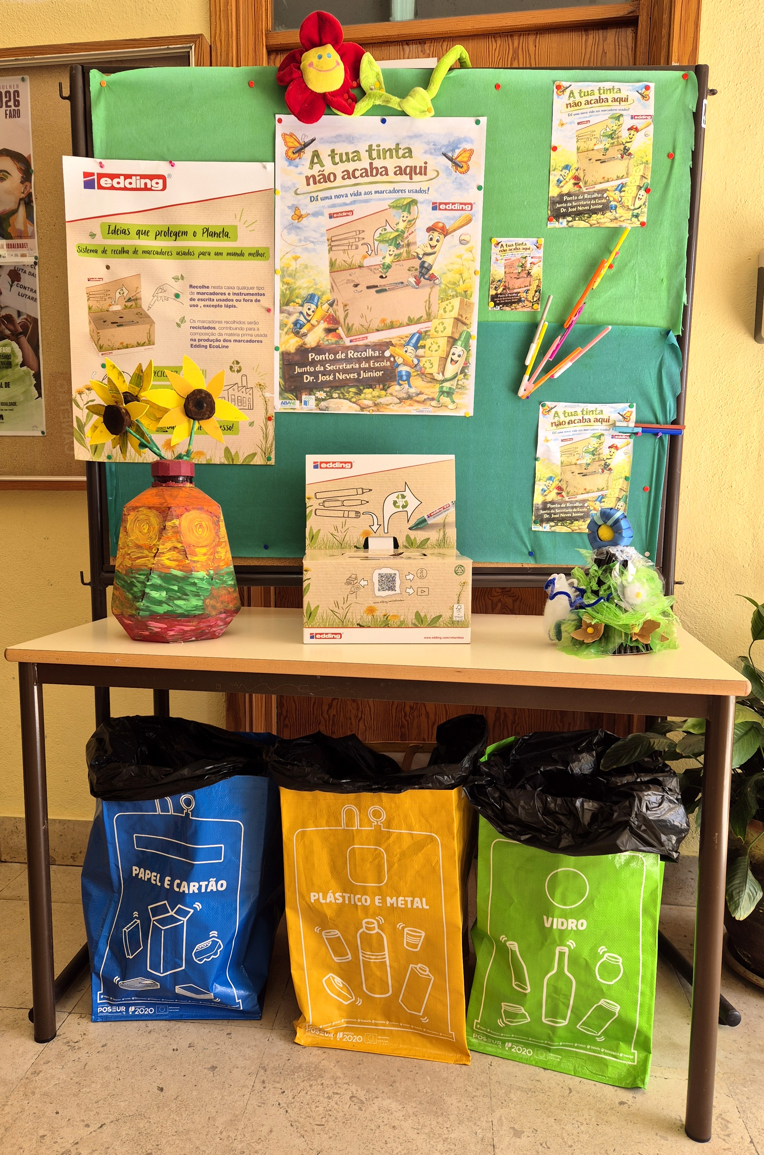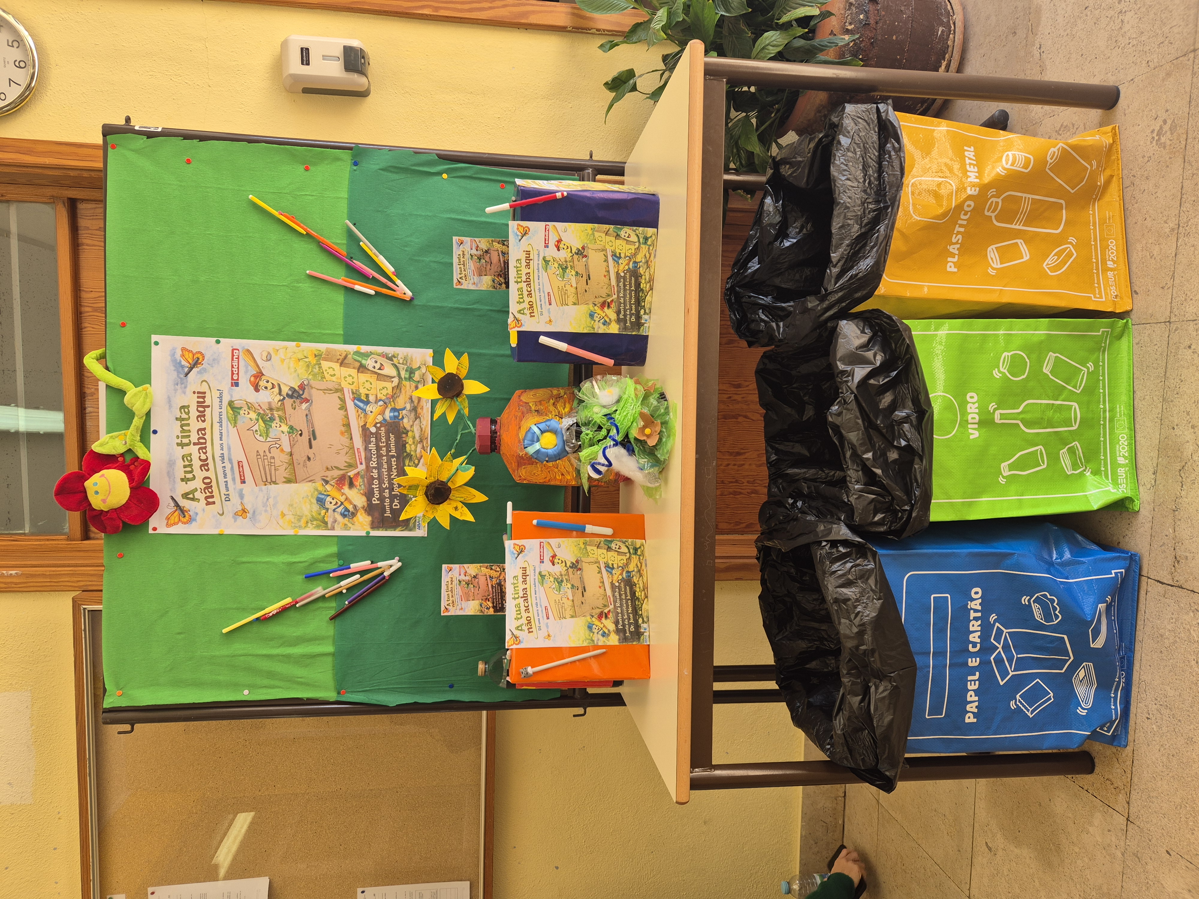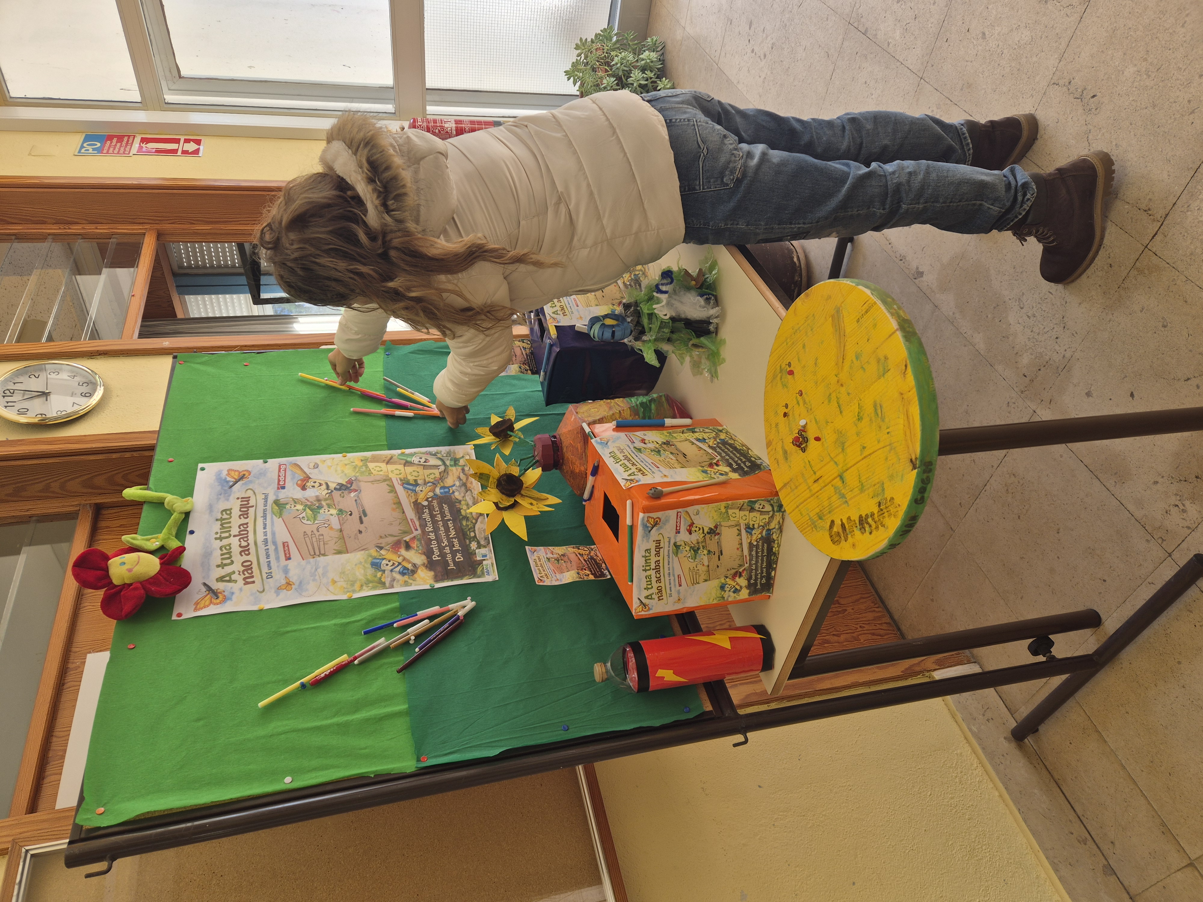 Não estando disponível a Return Box original, os alunos organizaram uma solução alternativa. Foram decoradas duas caixas que passaram a funcionar como ponto de recolha de canetas e de marcadores sem tinta, até à chagada da Return Box original. As caixas foram colocadas em frente à secretaria da escola, local de elevada visibilidade e de circulação, juntamente com o cartaz final e alguns elementos decorativos, garantindo a fácil identificação do espaço e divulgação da iniciativa.