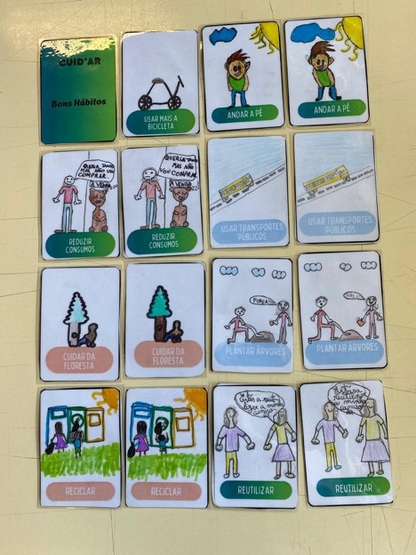 Numa segunda fase, os alunos aplicam os conhecimentos adquiridos na construção de um Jogo da Memória, que inclui conceitos, imagens e informações recolhidas anteriormente. Esta atividade plástica, acompanhada da elaboração de um cartaz para divulgação, reforça a aprendizagem de forma lúdica e colaborativa. A duração da aula é de 90 minutos ao todo, onde os estudantes desenvolvem competências relacionadas com a identificação de poluentes, a valorização de comportamentos que promovem um ar mais limpo e o reconhecimento da importância de proteger a qualidade do ar para a saúde e para o ambiente.