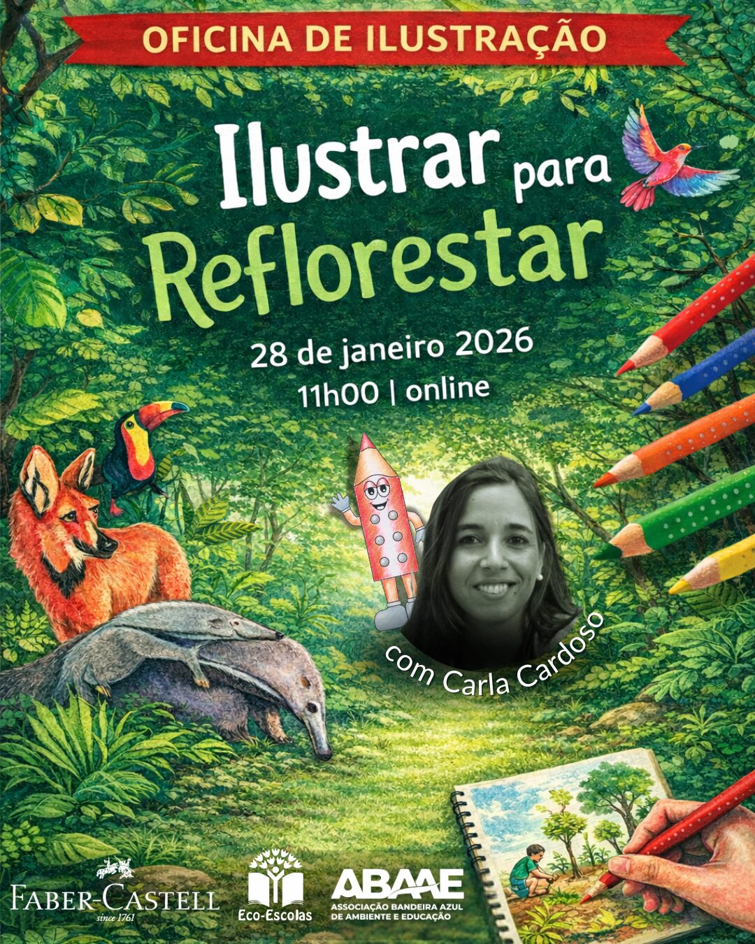 No âmbito do desafio Faber-Castell “Ilustrar para Reflorestar”, a Associação Bandeira Azul de Ambiente e Educação, em parceria com a Faber-Castell, irá dinamizar a sessão online Oficina de Ilustração – “Ilustrar para Reflorestar”, no dia 28 de janeiro às 11h, com o objetivo de contribuir com algumas ideias e ferramentas para a participação das escolas neste desafio, sendo a professora Carla Cardoso a formadora desta ação.